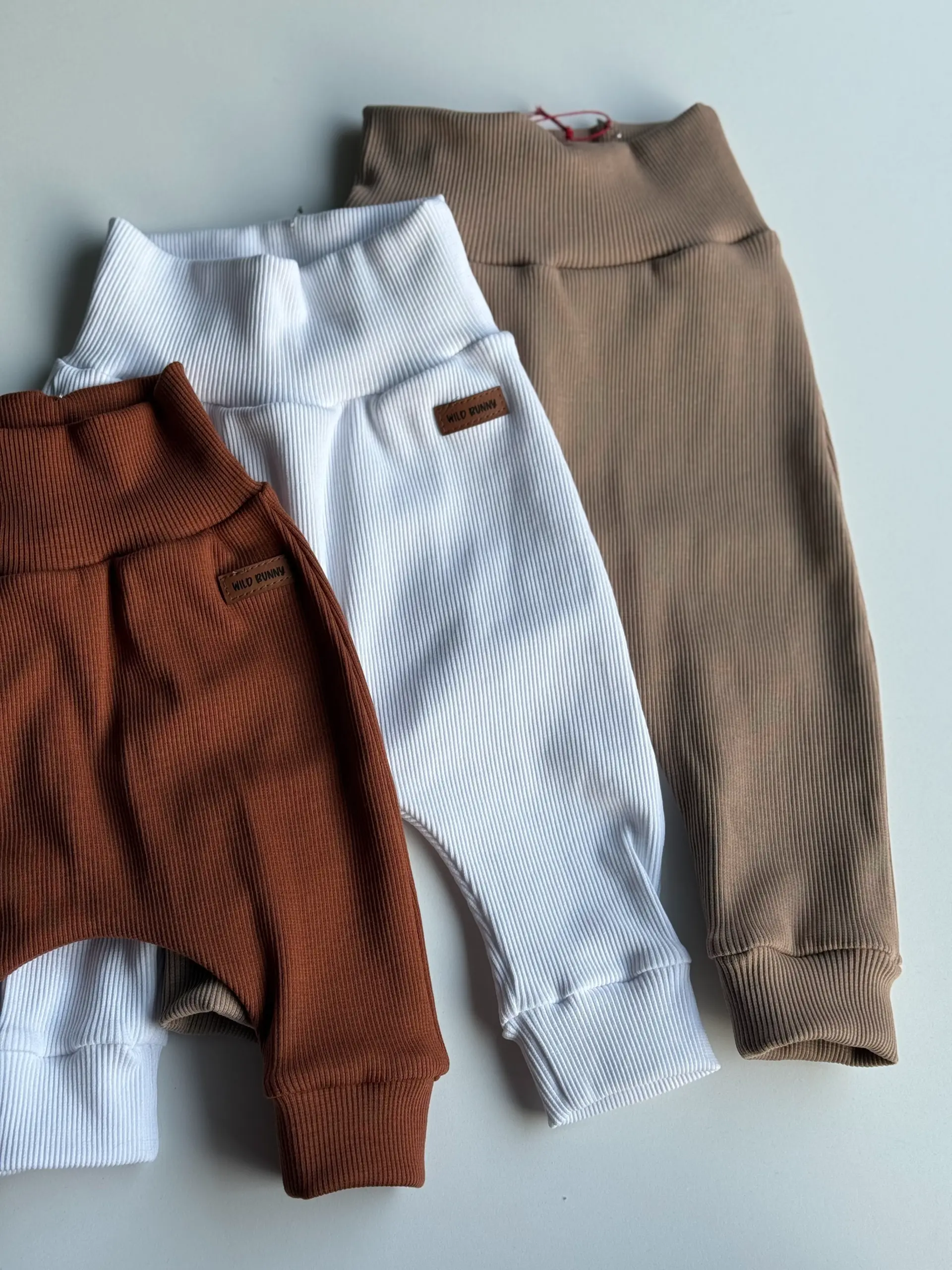 Uszyte z miękkiej, elastycznej prążkowanej dzianiny. Bezuciskowy pas delikatnie dopasowuje się do brzuszka, nie powodując dyskomfortu, a baggy krój nadaje im luźny, modny charakter.